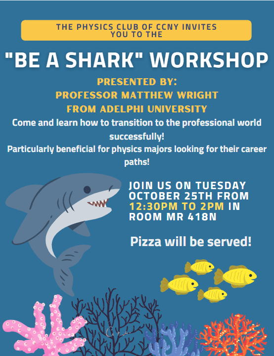 I am so happy to have been invited to give my “Be a Shark” workshop at CCNY today. Actually it was a hybrid of the talk I gave at Physcon and the APS Career Mentoring Fellows talk from 2021. I am spending some more time building this talk out and making it as useful as possible. So if you or your students are looking for a *phun* physics career talk, look me up.